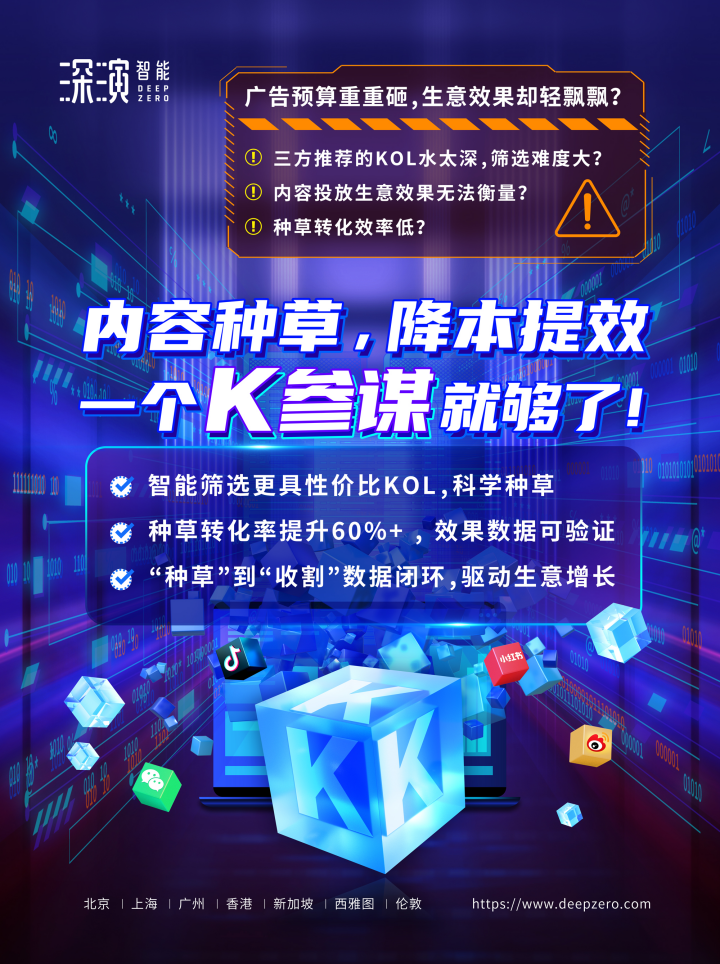 通宝TB888智能K参谋科学前选,可跨领域找到最能影响品牌目标TA人群的KOL进行投放,同时有效平衡投资回报率;内容营销数据可同电商后链路平台打通,进行数据归因分析,准确判断KOL影响的用户是否真实在电商平台产生购买行为;实现“种草”到“收割”链路闭环,轻松内容营销,可根据品牌方的业务需求提供一站式的KOL采买及数据验证服务,有利提升整体内容营销的效率与效果。