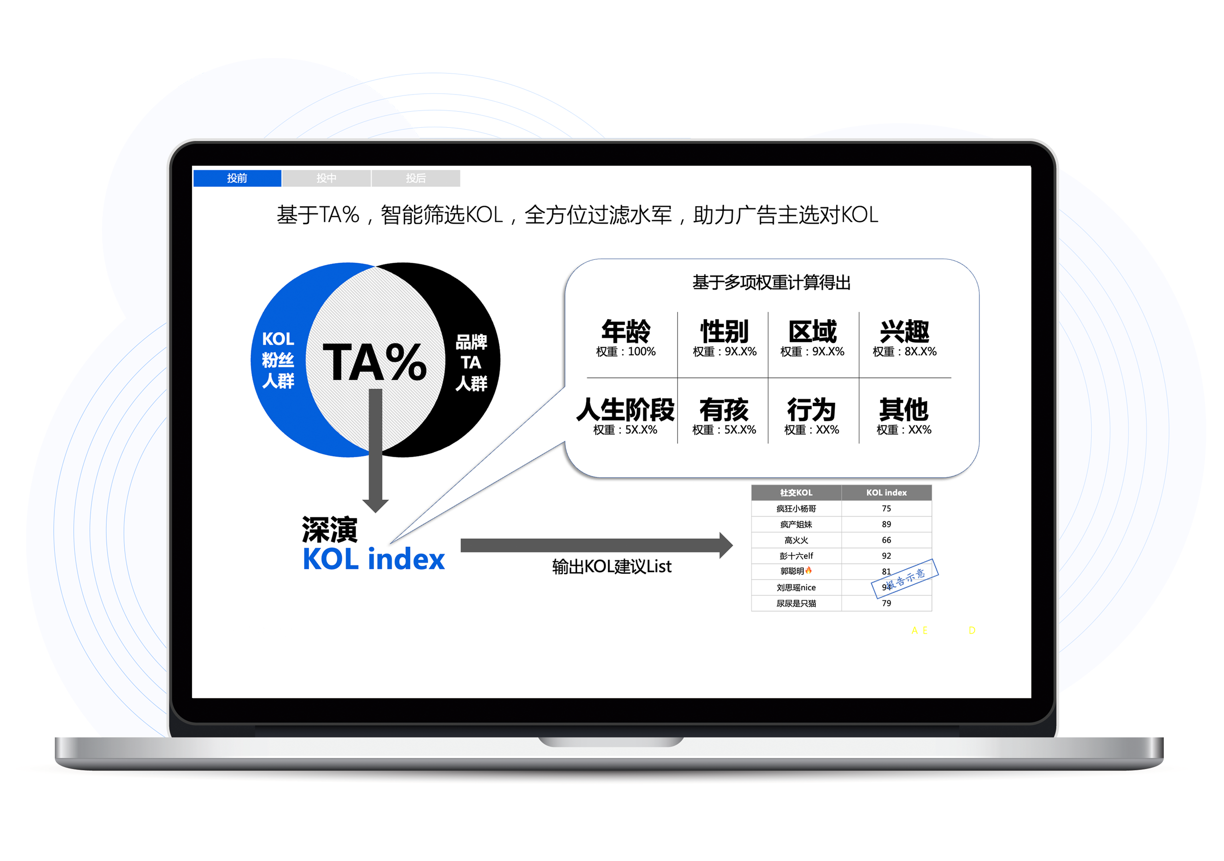 通宝TB888智能K参谋将品牌TA人群同各大KOL真实互动人群进行重合度分析,通宝TB888智能K参谋将找到最适合的目标KOL,品牌方再不用被选择KOL类型还是头部大V而困扰
